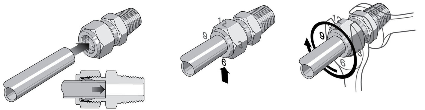 1、 把卡套管完全插入接頭內(nèi)并頂住肩部,用手將螺母擰緊;高壓應(yīng)用和高安全系數(shù)系統(tǒng):進(jìn)一步擰緊螺母,使卡套管無(wú)法用手轉(zhuǎn)動(dòng)或無(wú)法沿軸向在接頭內(nèi)移動(dòng);